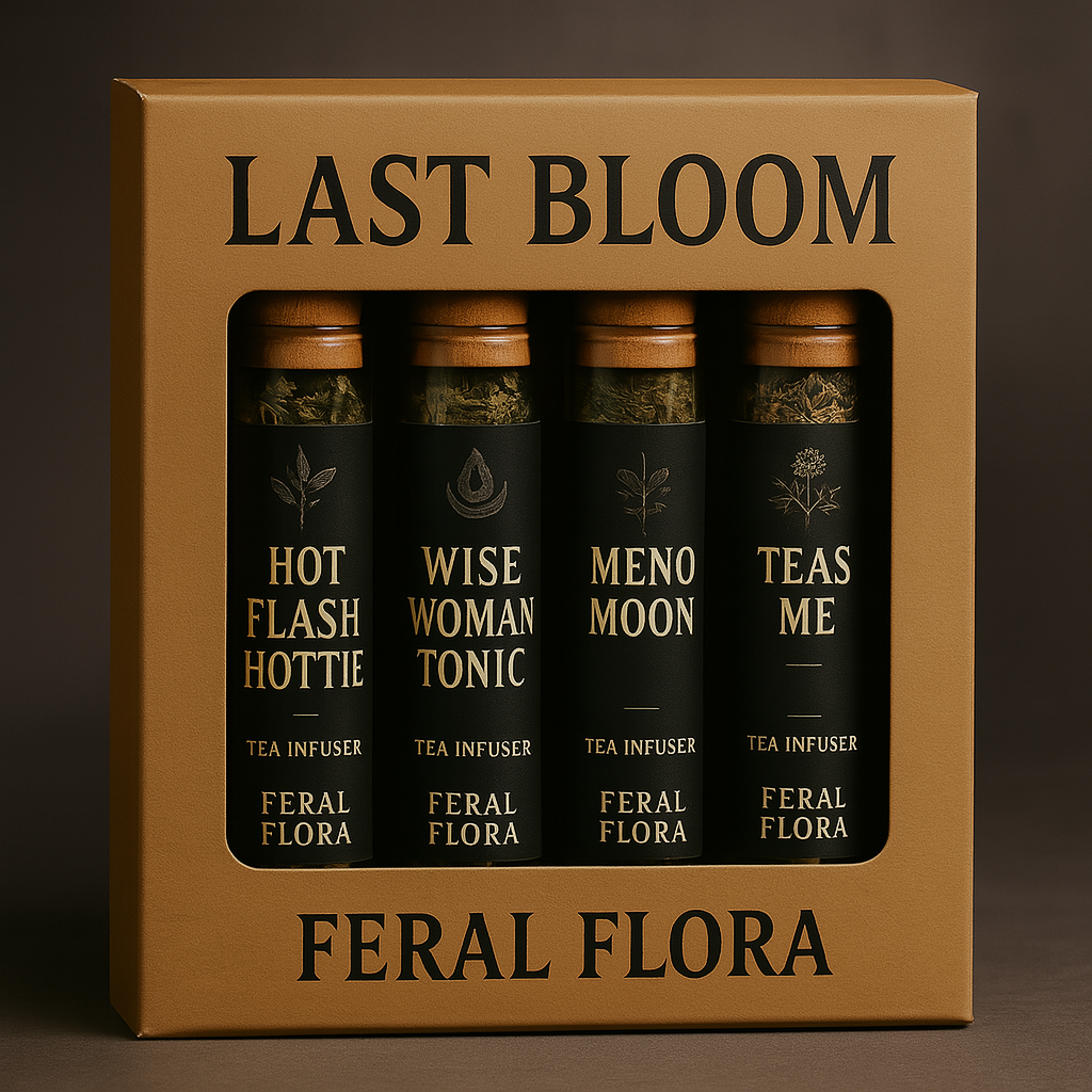 The Last Bloom Ritual Box includes three 1 oz shooter tubes designed to cool the fire, calm the mind, and nourish your beautiful, transforming body.