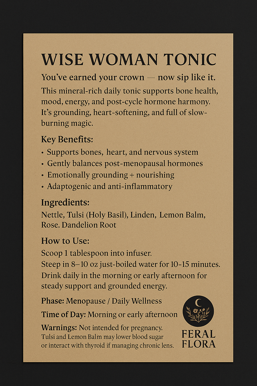 You’ve earned your crown — now sip like it. This mineral-rich daily tonic supports bone health, mood, energy, and post-cycle hormone harmony. It’s grounding, heart-softening, and full of slow-burning magic.